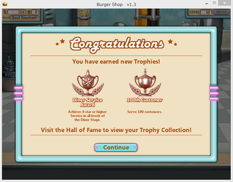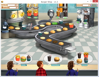 Burger Shopは、ベルトコンベアーにパティ、バンズ、レタスなどが並んでいるので、お客のオーダーに沿って材料をクリックしてハンバーガーを作ります。材料を乗せる順番はバラバラでも大丈夫です。空のプラスチックコップやポテトカップはそれぞれジュースのサーバーやフライマシーンなど適切な場所にドラッグ&ドロップします。でき上がったら右クリックでお客の元に提供されます。英語ではありますが、最初にチュートリアルがあるのでそれに従っていけば操作方法は簡単に覚えられるでしょう。
